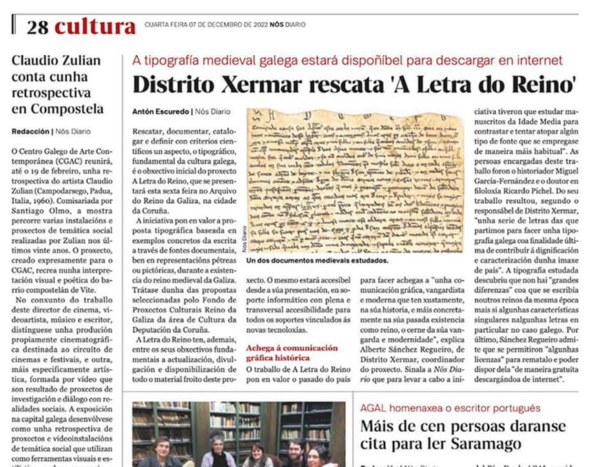 El proyecto también incluye una plataforma en línea donde puede descargar la tipografía de forma gratuita, junto con un informe detallado del proceso de investigación. La difusión estuvo involucrada en figuras prominentes de cultura gallega y asociaciones culturales que promovieron su uso y valor, reforzando la conexión con nuestra historia y nuestra herencia.